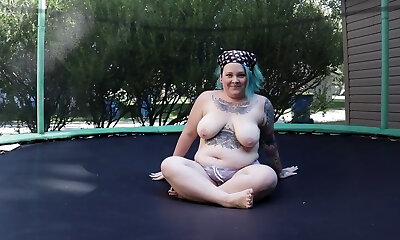 Fat Tattooed Milf Jumping and Undressing on a Trampoline
