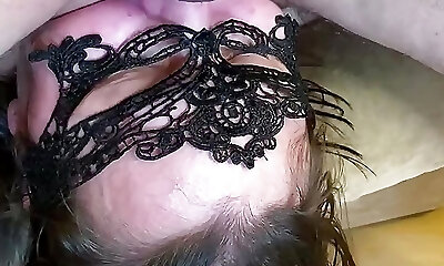 Dazzling milf with big tits unpinning her guy attire then providing him blowjob in close up shoot