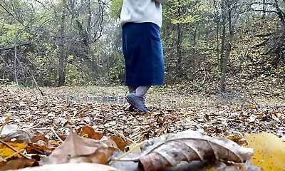 Curvy MILF in a long skirt pissing in the autumn park