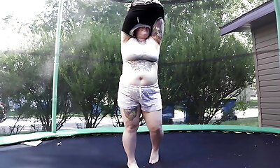 Fat Tattooed Milf Jumping and Undressing on a Trampoline